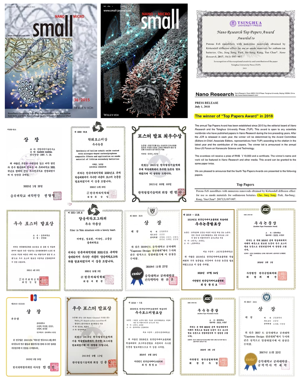 ‘Golden Bristlegrass‐Like Hierarchical Graphene Nanofibers Entangled with N‐Doped CNTs Containing CoSe2 Nanocrystals at Each Node as Anodes for High‐Rate Sodium‐Ion Batteries(강아지풀 형태의 CoSe2 결정을 포함하는 CNT로 얽힌 그래핀 나노섬유의 고율 나트륨전지 음극)’이라는 제목으로 게재된 이 연구는 그래핀 기반 섬유에 탄소나노튜브를 균일하게 성장시킨 후 수 나노 크기의 전이금속 칼코겐화물을 탄소나노튜브 내에 포함시킴으로써 소듐이온 배터리로 적용 시 현저히 높은 출력특성을 보고했다.